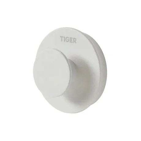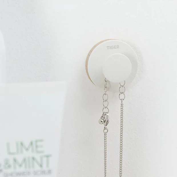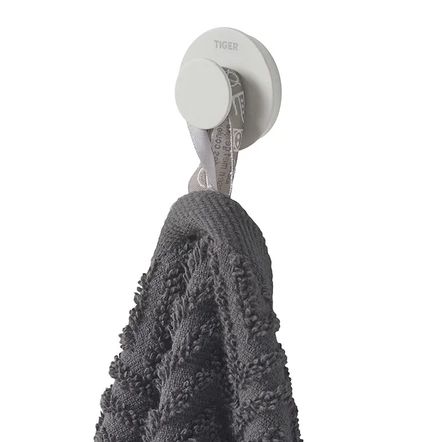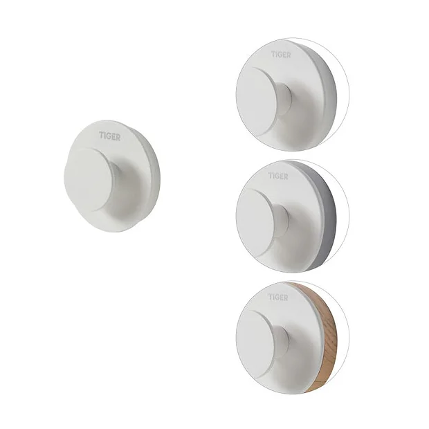 The Tiger Urban Towel Hook in White comes with two decor rings. The decor rings, in the color light oak and grey, make it possible to add a subtle color accent. It is also possible to mount the hook without the decor ring, making it very easy to adapt the product to the desired style. The hook is provided with strong double-sided tape, which makes mounting on any smooth, solid surface very easy.